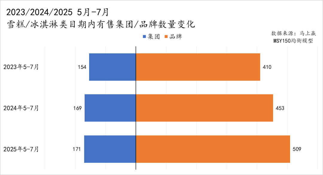 经历了过去两年类目的“动荡”,类目内的经营集团/品牌数量变化如何?从2023至2025年5-7月有售的集团/品牌数量变化来看,雪糕/冰淇淋类目的有售集团、品牌数量均持续增长。增长幅度上,品牌数量在2025年观察期内增速稍有提升,集团数量的增速则稍有放缓。