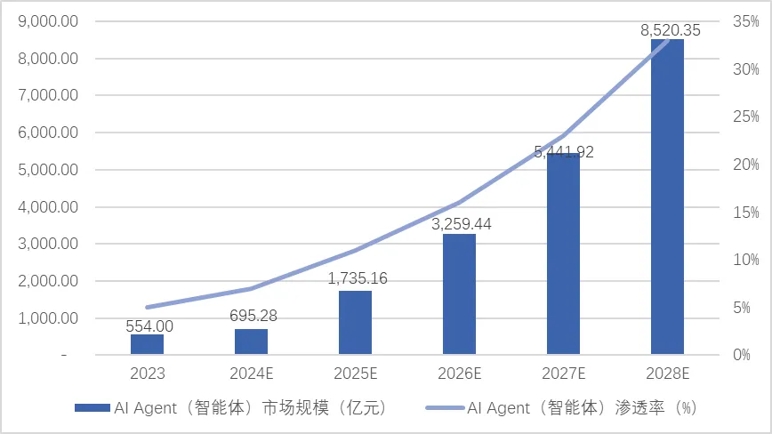 到2028年,约33%的企业级软件应用将内置具备自主功能的AI Agent系统,远高于2024年时不足1%的渗透率,这表明在未来数年内AI Agent从辅助工具向业务决策层面的演变成为重大趋势。