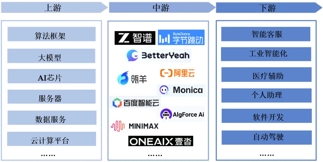 下游环节围绕金融、医疗、制造、零售、交通等场景开展应用部署,推动企业智能化转型和用户体验升级。
