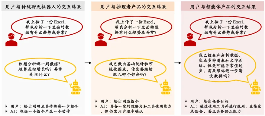 AI Agent与传统AI、AIGC(人工智能生成内容)之间亦存在着明确的层次递进和功能定位差异。下图展示了用户与传统聊天机器人、AIGC以及AI Agent产品交互时的对话结果,可以看出,AI Agent产品在用户交互体验和自动化能力上具有明显优势。