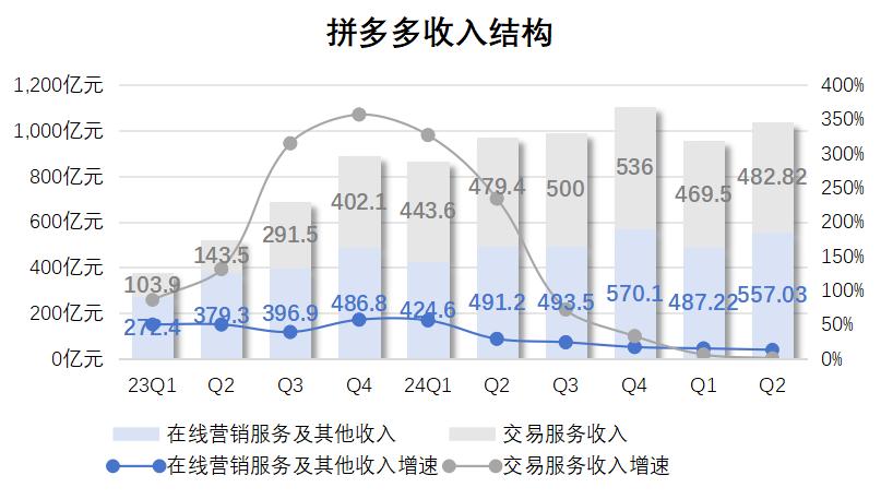 二季度,拼多多收入仍然保持了两位数增长,财报显示,季度内总收入1039.9亿元,同比增长7%,低于上个季度的10%,远低于去年同期的86%。