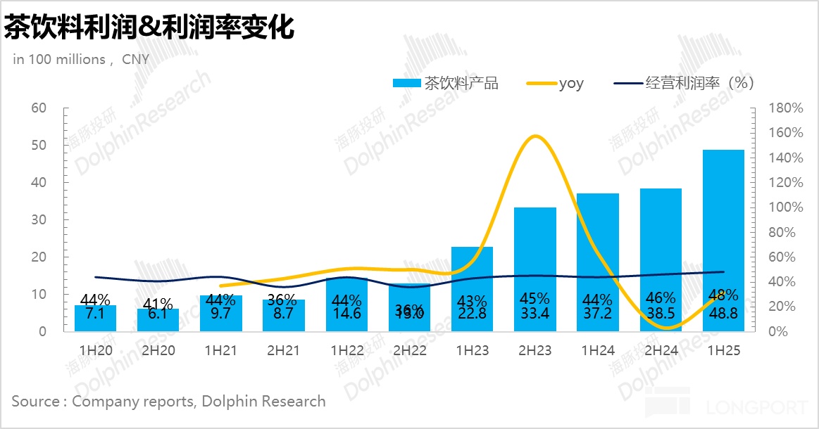 2、茶饮盈利能力创新高:25H1 茶饮业务实现营收 100.9 亿元,同比增长 19.7%,考虑到当前茶饮半年破百亿的体量,相较于前两年爆发式的增长有所放缓也在预期范围内。