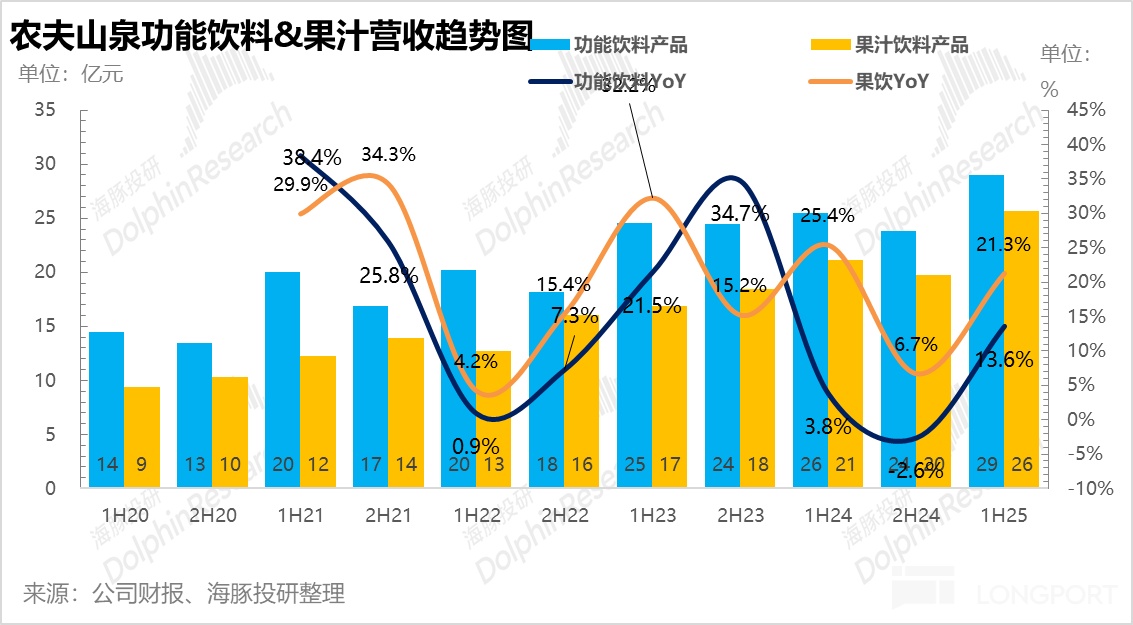 北京时间 8 月 26 日下午,农夫山泉(9633.HK)发布了 2025 年 H1 业绩,随着上半年舆论影响逐步消退,农夫重新加大了红瓶水的推广力度,并减少了绿瓶水的补贴,带动公司整体业绩全面回暖,超出市场预期,是一份不错的业绩。