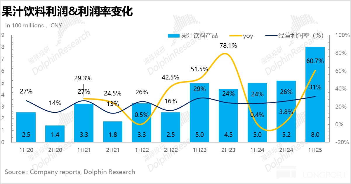 受益于 4 月份开始公司针对无糖茶大单品东方树叶推出的 “一元乐享” 活动(持续到 9/30 号),有效提升了消费者的复购率,叠加陈皮白茶、菊花普洱等复合新口味的推出,25H1 公司茶饮业务实现营收 100.9 亿元,同比增长 19.7%。超出市场预期(97 亿元)。