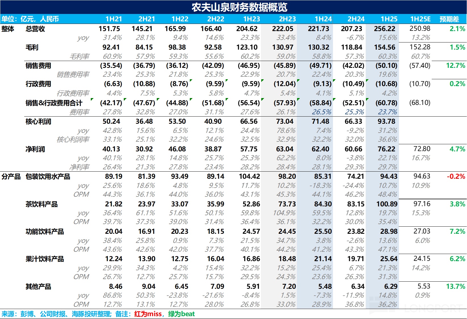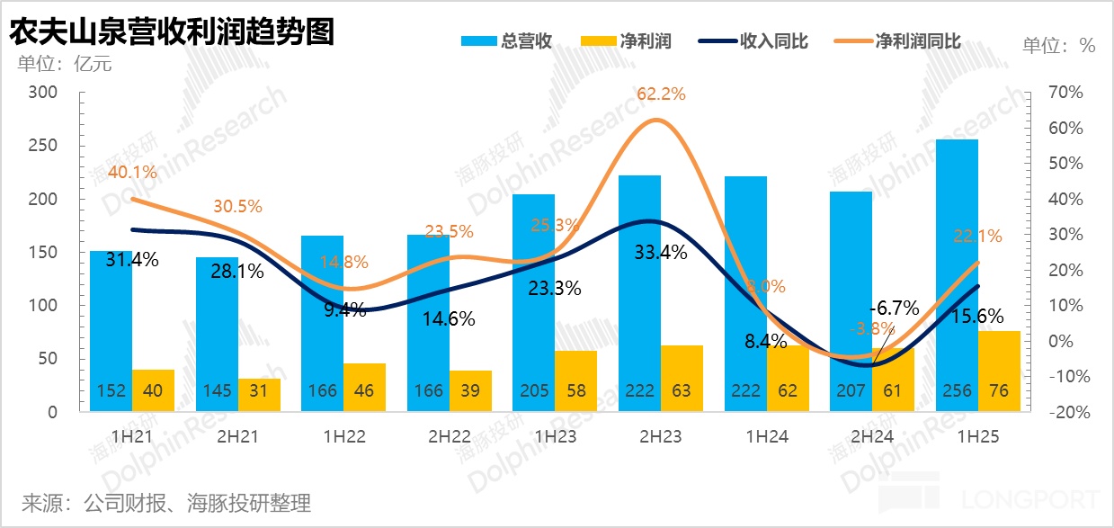 25H1 公司共实现营收 256.2 亿元,同比增长 15.6%,净利润 76.2 亿元,同比增长 22.1%,随着上半年舆论影响逐步消退,农夫重新加大了红瓶水的推广力度,并减少了绿瓶水的补贴,带动公司整体业绩全面回暖。另一方面,伴随公司运营能力的提升,经营杠杆释放下茶饮料、功能饮料等品类经营利润率也纷纷创下新高,总的来说是一份非常不错的业绩。