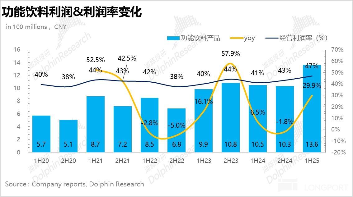 功能饮料(包括尖叫、力量帝等品牌)上半年实现营收 29 亿元,同比增长 13.6%,环比有所提速。结合调研信息,受益于夏季高温及运动场景需求的高景气度,电解质水(力量帝)加速铺货,网点从 2024 年底 120 万家提升至 180 万家,在整个功能性饮料中占比接近 50%。