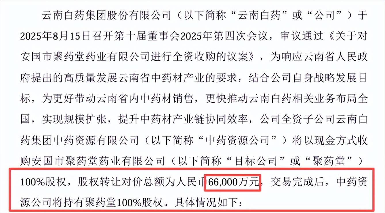 云南白药日前发布公告,旗下全资子公司中药资源,以6.6亿元现金收购河北省安国市聚药堂药业有限公司(下称“聚药堂”)100%股权。这是云南白药深耕中药领域的又一重要落子。