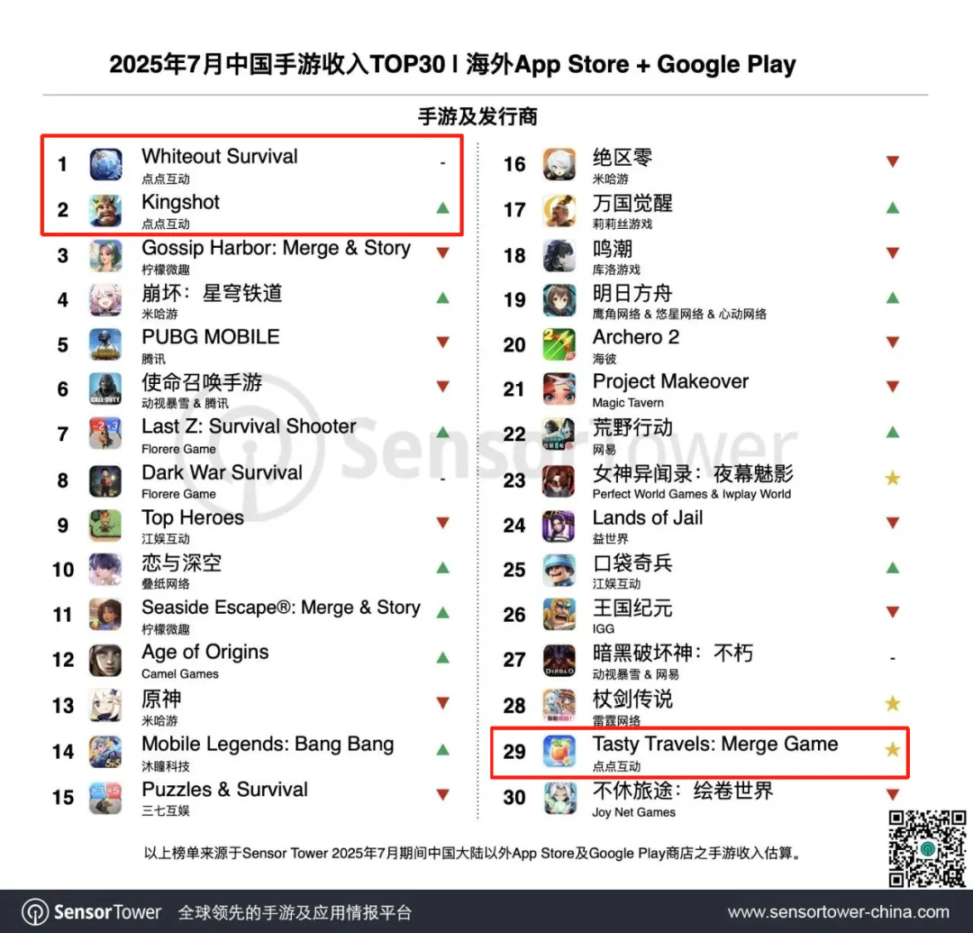 相比之下,新游带来的业绩增长整体提及较少,这与国内趋近饱和的市场环境不无关系。而在海外市场,更大的发展空间确实带来了新的发展机遇,典型案例如世纪华通,其子公司点点互动开发的《Whiteout Survival》与《Kingshot》成为现象级爆款,在SensorTower近期发布的7月中国出海手游收入Top30中位列前两位,受此带动,顶着ST帽子的世纪华通在过去一年,股价暴涨超300%。