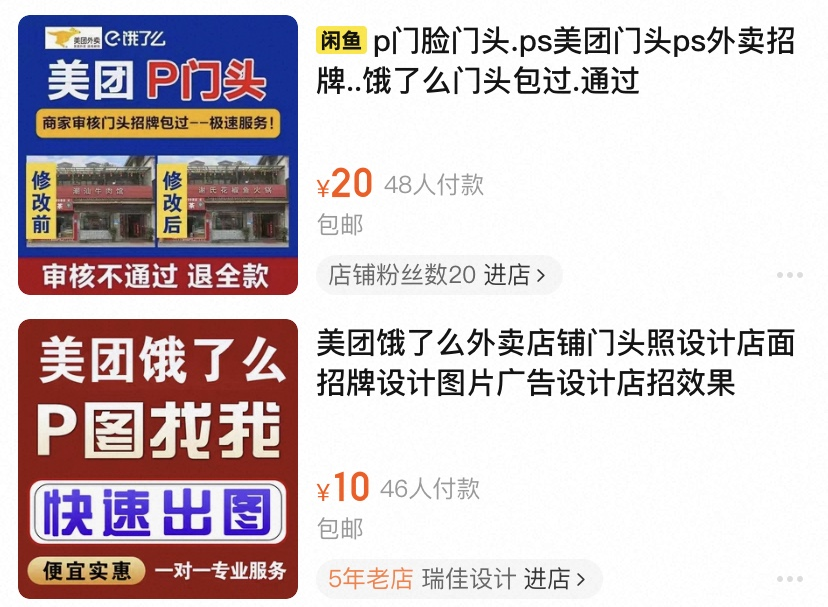 在淘宝等电商平台,就有不少商家提供“P门脸门头”“饿了么门头包过”等服务,价位在10元-40元不等,不少店铺总销量上千。除此之外,还有一些商家提供AI素材模板,从店铺招牌到头像logo再到菜品,应有尽有。