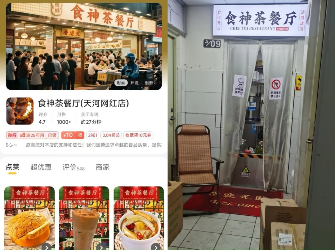 另有一名网友称,“我以为的茶餐厅是正规军,没想到吃完后天塌了。”据其发布的图片,平台商家图是显而易见的AI图,而实体店却是狭窄的小作坊。在评论区,有网友回复称;“好崩溃,我很信任这些图的,没想到是假的”。