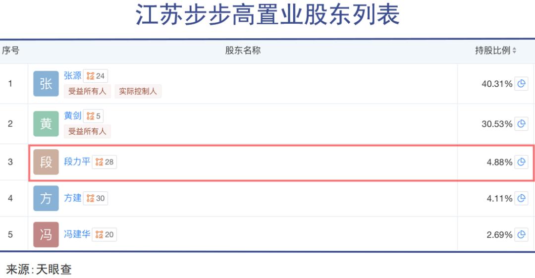 据天眼查显示,段永平的哥哥段力平是江苏步步高置业的第三大股东,持股4.88%;苏州步步高投资的股东列表中,王晓梅持股4.73%股份,有资料显示,段力平妻子也叫王晓梅。