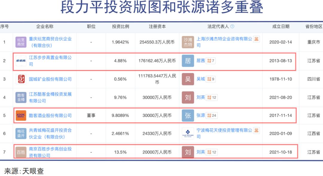 不仅如此,段永平家族更是深度参与着张源的商业投资,涉及地产、酒业、电子批发、创投等领域。比如张源旗下酷客酒业、江苏百胜电子、大千生态、利源股份等等公司中,段力平都有持股或任职。