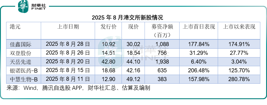 8月的新股包括从事钨矿开采的佳鑫国际资源(03858.HK)、专注于储能电池及相关解决方案的双登股份(06960.HK)、半导体设备和材料股天岳先进(02631.HK),以及两家按照18A章上市的未盈利生物科技公司银诺医药-B(02591.HK)和中慧生物-B(02627.HK),还有介绍形式上市的东阳光药(06887.HK)。