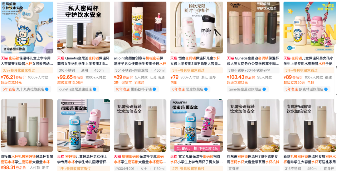 惊蛰研究所在查找指纹水杯相关的产品时就发现,2019年前后,市面上还出现过带有机械拨轮密码锁的儿童水杯产品,当时的产品售价也在100元到200元之间。后来随着指纹识别模块的成本下降,市面上又出现了融合了指纹和密码锁的新产品。而如今,只带有机械密码锁的儿童水杯售价不到百元。