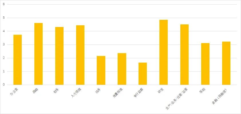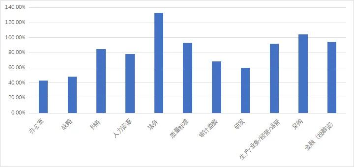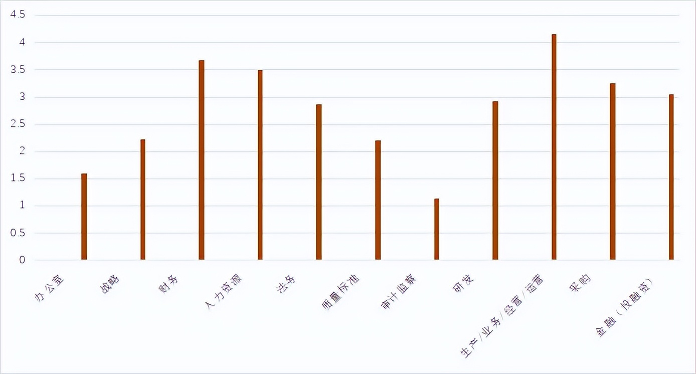 综合来看,各类职能在复杂程度上可以分为三个档次:第一档是后台的战略、财务和人力,以及中台的研发、生产/业务/经营/运营;第二档是后台的办公室,以及中台的采购、金融,这些职能相对标准化;第三档则是高度依赖标准化的法务、质量标准和审计监察。