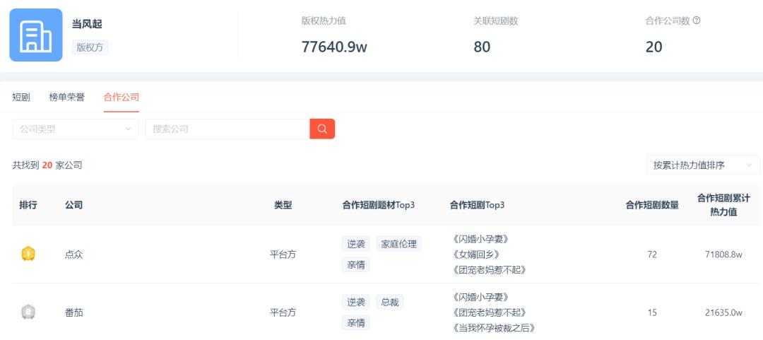 2025年,该平台进一步加大投资力度,3月全资收购当风起文化(2025年春节档热门短剧《好一个乖乖女》《老千》等爆剧的编剧团队)。据DataEye-ADX数据,当风起文化作为版权方共关联80部短剧,其中72部与平台合作,合作作品累计热力值超7亿,热力值3000万以上的作品有5部(《闪婚小孕妻》《女婿回乡》《团宠老妈惹不起》《父亲进城》《闪婚总裁:娶一送二》)。收购完成后,当风起文化归入该平台内部团队,有效增强了平台的内容创作能力与版权储备厚度。