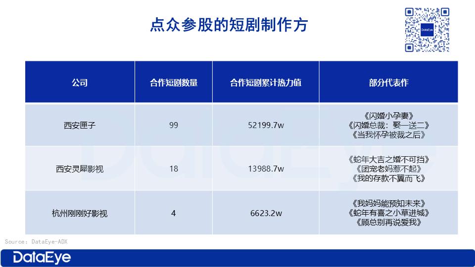 根据DataEye-ADX数据,市面上的爆款短剧往往集中于少数优质承制方,优质内容合作方(CP)成为稀缺资源。为保障制作质量与效率,股权投资逐渐成为平台绑定核心承制方的重要手段。
