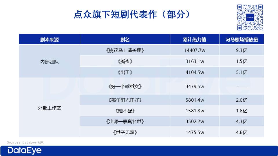 从代表作来看,内部团队自主创作、改编了《桃花马上请长樱》(首部破亿短剧)、《撕夜》、《出手》等多部作品;同时,通过内部团队与外部工作室的协同,联合推出《世子无双》、《出师一表真名世》等热门内容。