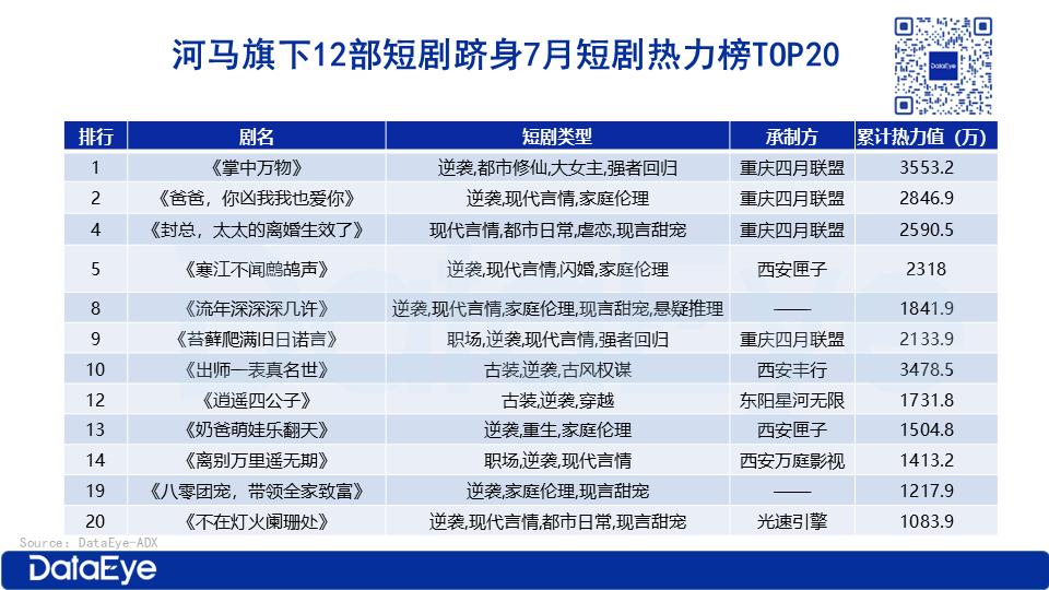 从市场表现来看,2025年7月DataEye短剧热力榜TOP20中,河马平台占据12席,占比达60%,且该平台旗下短剧已连续三个月登顶短剧热力榜月度榜单,其爆款短剧涵盖逆袭、现代言情、都市修仙、古风权谋等多个热门题材。