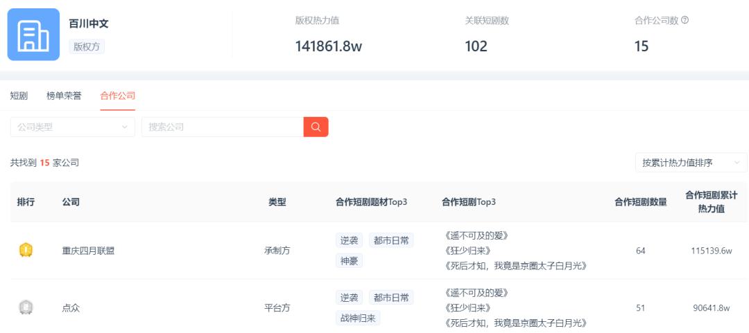 从合作承制方来看,12部上榜作品中,重庆四月联盟包揽4部(均跻身榜单TOP10),西安匣子影视贡献2部,成为平台爆款内容的重要供给方。