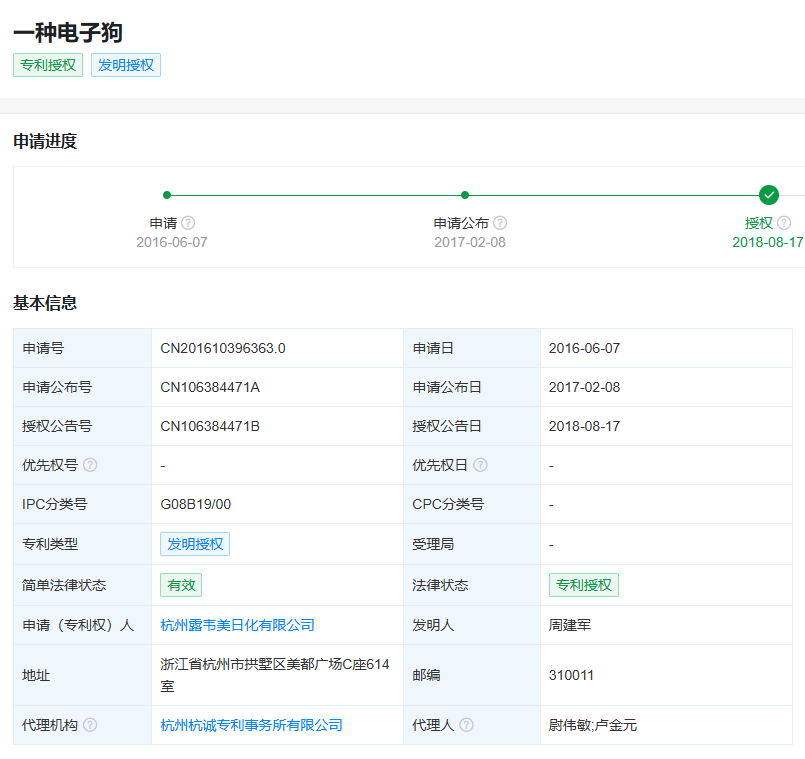 “一种电子狗”专利公开时间为2017年2月8日,在2018年获得授权,发明人为周建军。而宇树科技第一款四足机器人莱卡狗(Laikago),发布于2017年10月,从时间线来看,晚于露韦美专利公开时间,但露韦美目前尚未有“一种电子狗”公开的销售情况。