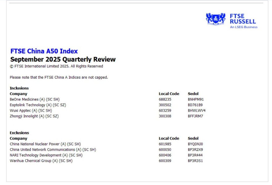 调整成分股的是富时中国A50,准备纳入百济神州(688225.SH,06160.HK ,ONC)、药明康德(603259.SH,02359.HK)、新易盛(300502.SZ )、中际旭创(300308.SZ),调整将于9月19日收盘后生效。