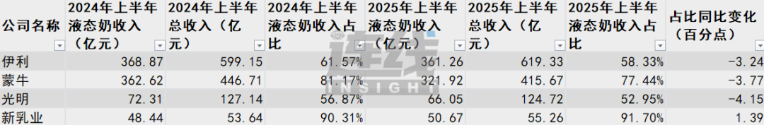 从液态奶收入占比较高的几家企业来看,2025年上半年,伊利、蒙牛、光明、新乳业的液态奶收入分别为361.26亿元、321.92亿元、66.05亿元和50.67亿元,占总收入比例分别为58.33%、77.4%、53%和91.70%。
