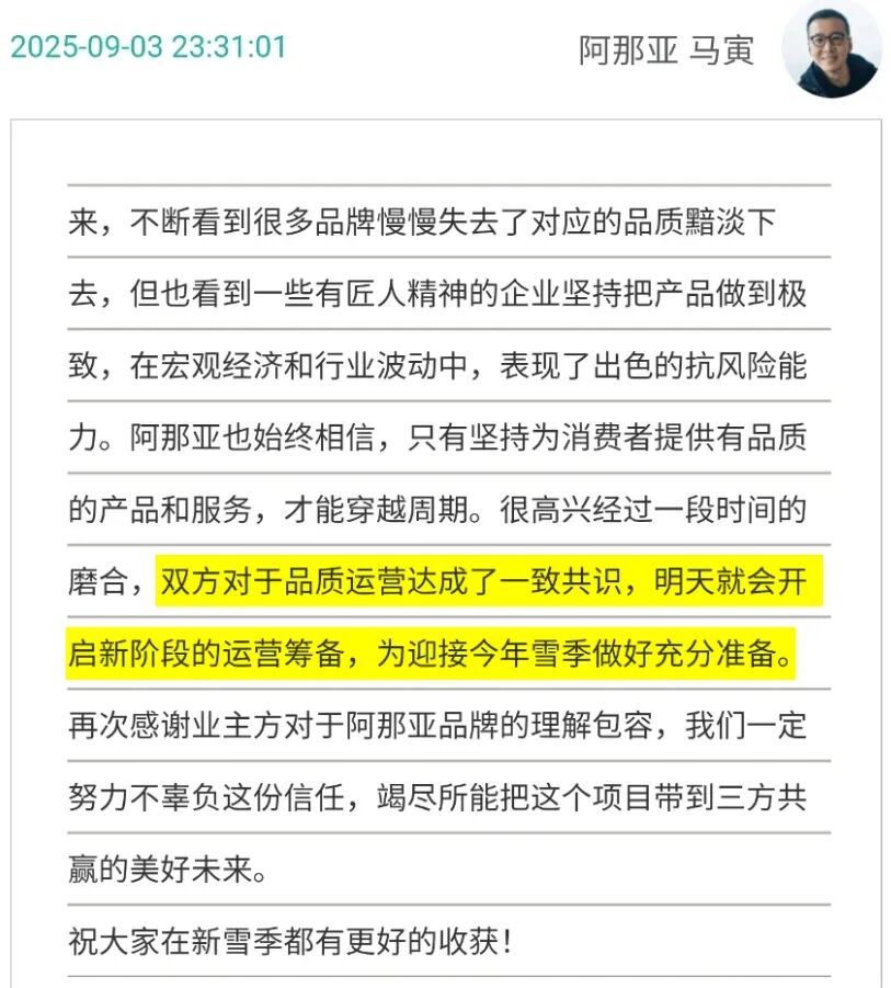 有业主社媒上分享,9月3日晚间阿那亚品牌创始人马寅再发回信,称双方经过认真沟通,就本项目签署了全部合作协议。
