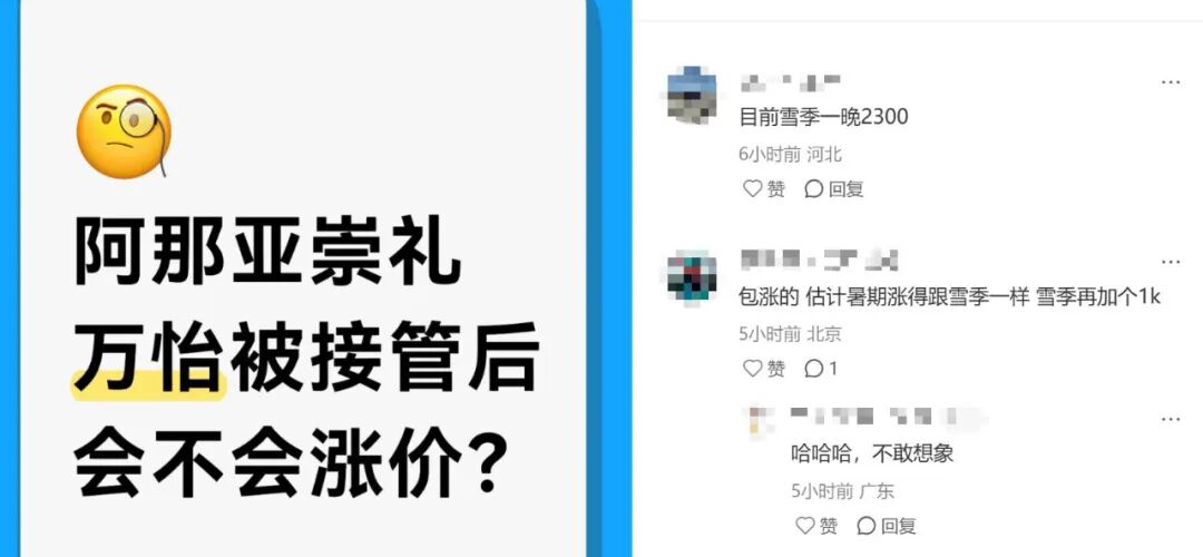 如果今年雪季万怡真的涨价了,那其他阿那亚自有民宿、酒店是不是也要跟着一起涨,作为游客得多花多少钱去订房订产品?这不是摆明要被多“割”一刀肉吗?