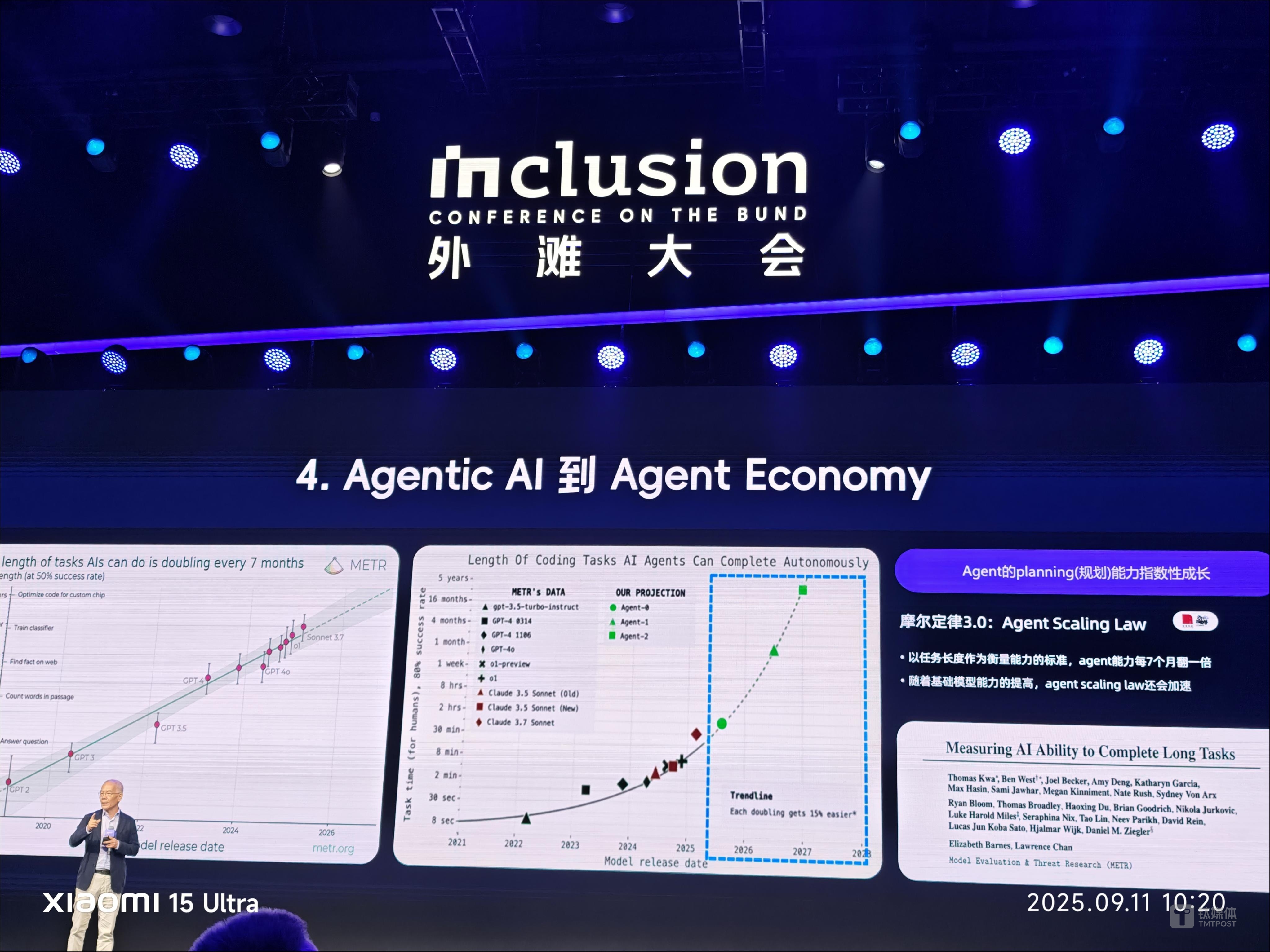 张宏江提到,AI Agent智能体的规划能力指数性成长,并出现摩尔定律3.0,一方面,以任务长度作为衡量能力的标准,Agent能力每7个月翻一倍,另一方面,随着基础模型能力提高,智能体的Scaling Law还会加速。