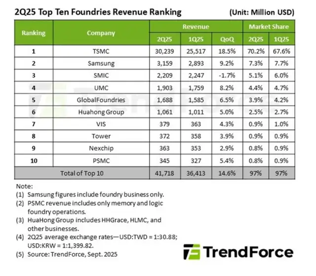 打开全球各大晶圆代工厂2025Q2的财报 ,TSMC一枝独秀:营收同比增长大于40%,遥遥领先行业平均,市场份额进一步扩大到70%。
