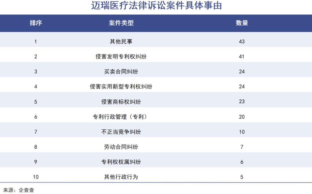 企查查数据显示,迈瑞医疗如今在有具体事由的法律诉讼案件中,“侵害发明专利纠纷”高居第一位,此外还有“侵害实用新型专利权纠纷”“专利行政管理”“专利权权属纠纷”。涉及专利类的案件总数为91件,占TOP10案件总数的44.83%。