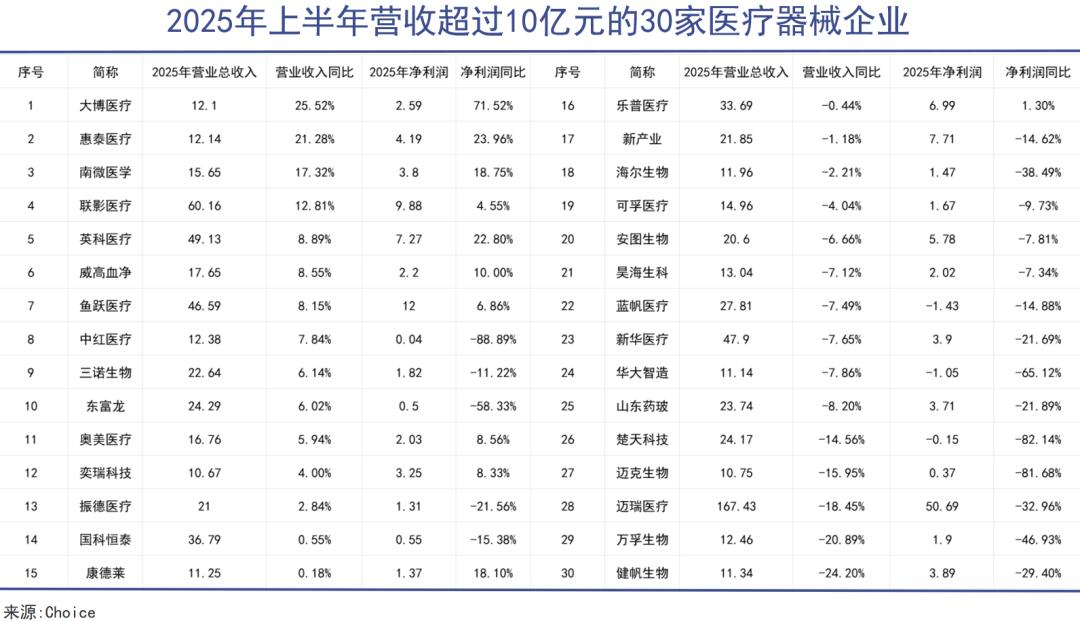 “技术同质化”现象使得迈瑞医疗产品的可替代性在不断增加,市场份额也在不断被竞争对手猛追。根据Choice金融终端中显示的申万医疗器械行业数据,在2025年上半年营收超过10亿元的30个企业中,迈瑞医疗营收增速列倒数第3,净利润增速列倒数第8。
