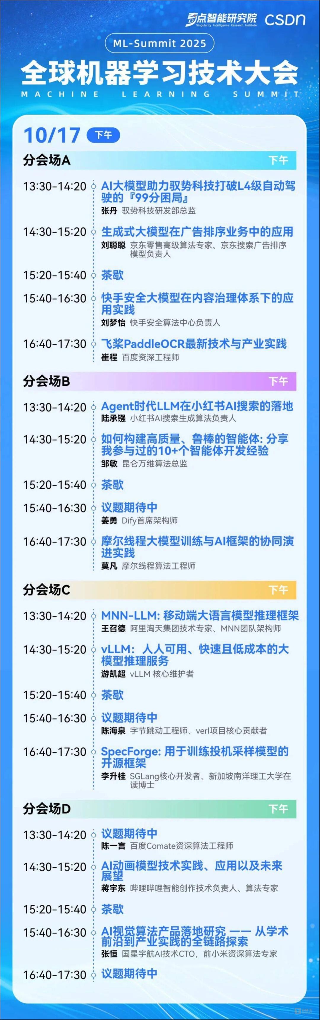 正是在这种历史周期的加速交替与范式转换背景下,由 CSDN 与奇点智能研究院联合举办的 2025 全球机器学习技术大会将于10月16–17日在北京威斯汀酒店召开,届时全球顶级学者与产业领袖将齐聚一堂。在这里,我们将不再仅仅停留在对未来的想象,而是与 50 余位顶尖专家一道,深度剖析这些核心命题,共同探索 AI 时代的无限可能。