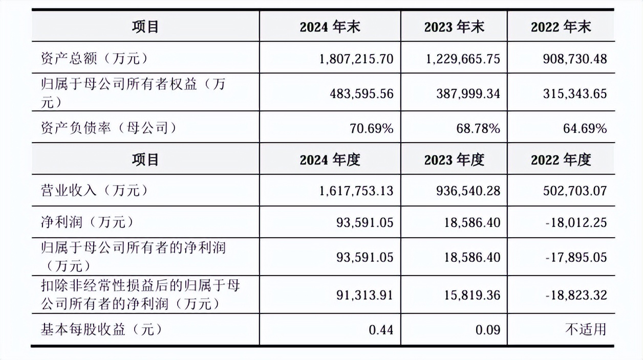 招股书显示,2022年至2024年,公司实现营收50.27亿元、93.65亿元、161.78亿元;归母净利润-1.8亿、1.86亿元、9.36亿元。