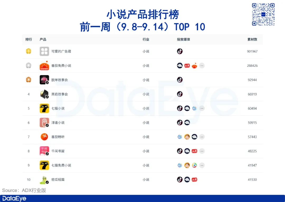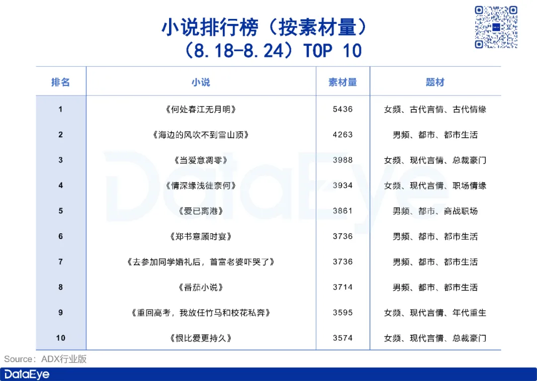 ADX行业版数据显示,前一周(9.8-9.14)小说排行榜(按素材量排序)前十名均为女频言情小说,占比100%,类型涵盖现实生活、现代重生、职场情缘和总裁豪门。