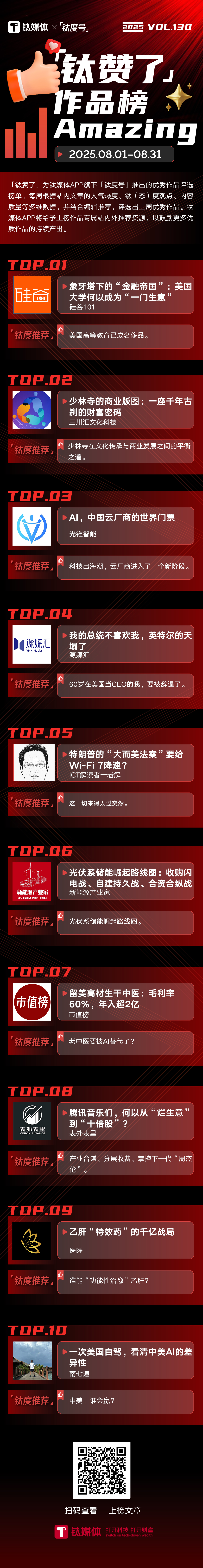2025年8月1日—2025年8月31日,「钛赞了」榜单第130期上榜作品为: