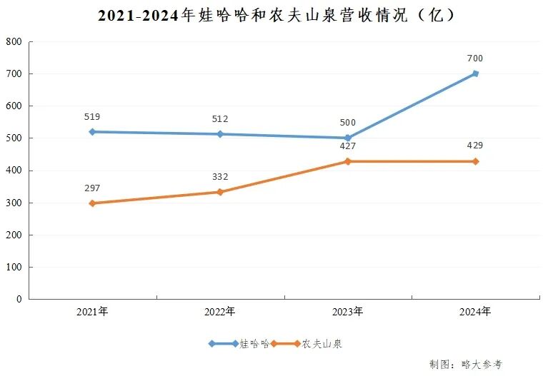 图注:农夫山泉近几年的营收增速明显比娃哈哈快,24年受舆论影响业绩回落