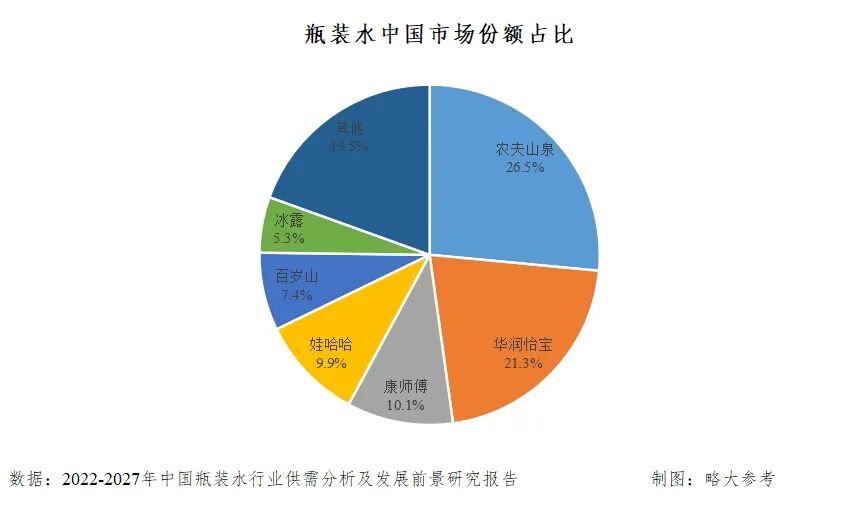 从市场占有率来看,头部包装饮用水企业的地位较为稳固。娃哈哈以9.9%的市场份额排名第四,多年未变。其余头部,农夫山泉、华润怡宝、康师傅、百岁山、冰露市场份额分别为 26.5%、 21.3%、10.1%、7.4%、5.3%,六家企业的市场占有率总和就高达80.5%。