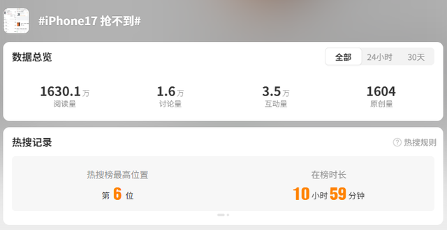 最终,市场用最真实的反应回报了库克的“诚意”,“iPhone 17抢不到”迅速冲上微博热搜,全渠道秒光,开售前全系列预约总量已然突破700万。