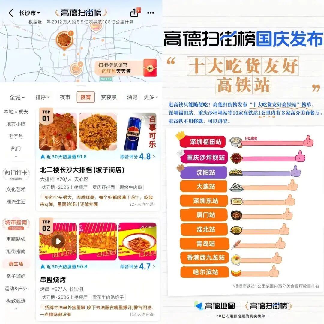 高德在国庆第3天宣布扫街榜“累计去重用户超4亿”。美团发布最新数据也显示,9月以来,“必吃榜”、“必玩榜”的搜索量同比分别提升96%和145%。