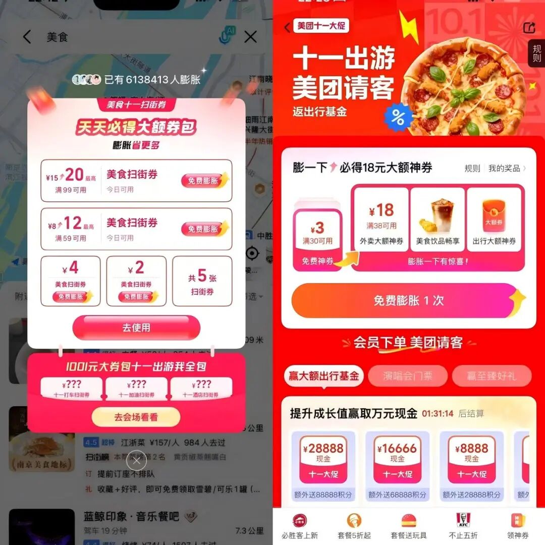 这个国庆,高德推出了“每天分1亿红包”活动,加码红包补贴。另一边的美团,撒钱则覆盖了“吃喝玩乐行”,为消费者提供酒店、门票、闪购、外卖等多类消费券。