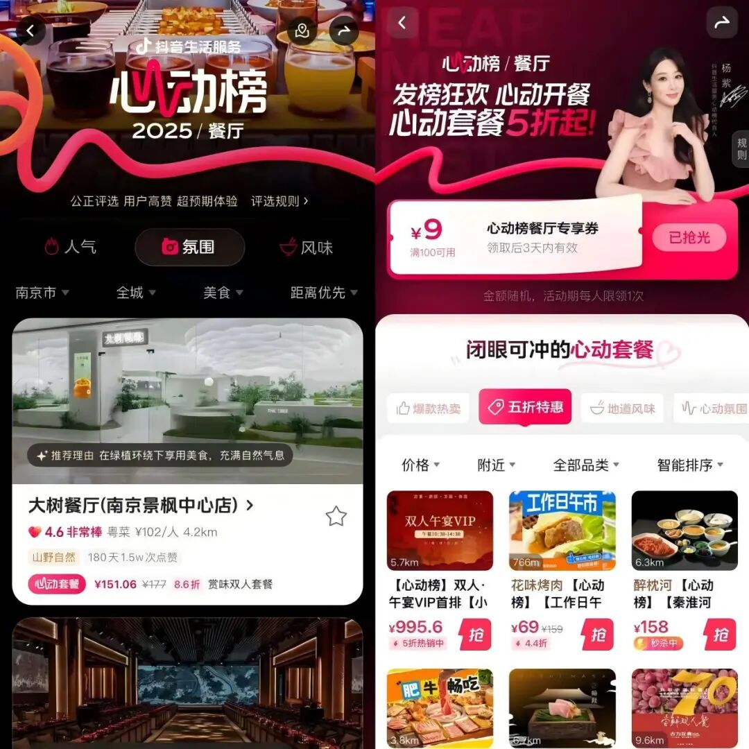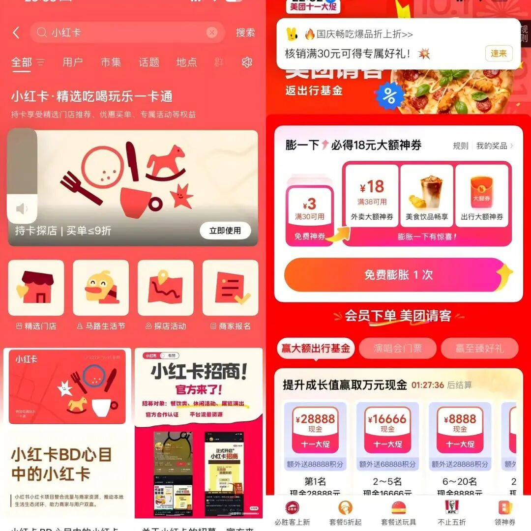 小红书以“小红卡”低调入局,抖音生服“心动榜”从餐饮拓宽至酒旅,覆盖的城市和餐饮也呈现出下沉趋势。