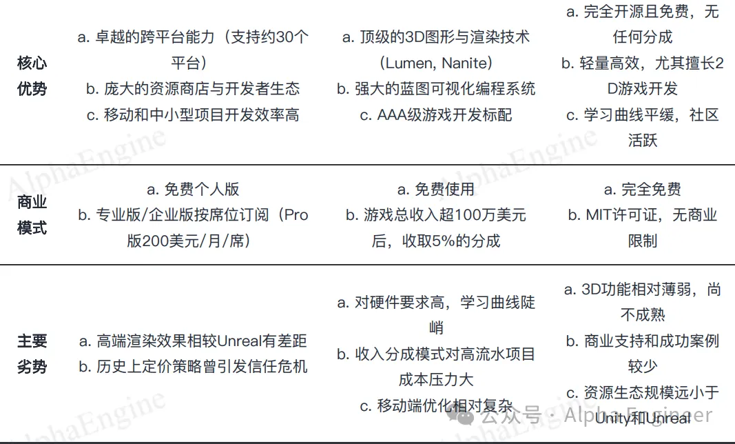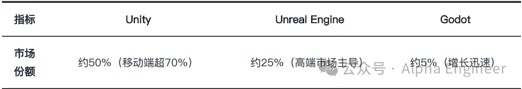 在游戏引擎领域,Unity、Unreal Engine和Godot三大游戏引擎在市场定位、商业模式和技术特性上存在显著差异,形成了差异化的竞争格局。