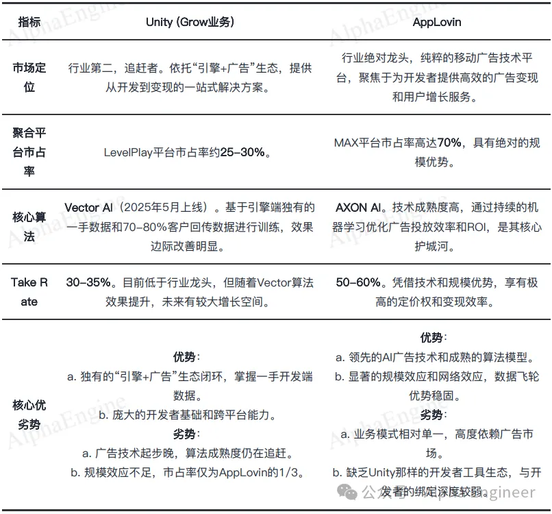 在移动游戏广告技术领域,Unity(Grow业务)与行业龙头AppLovin形成“双雄”格局。
