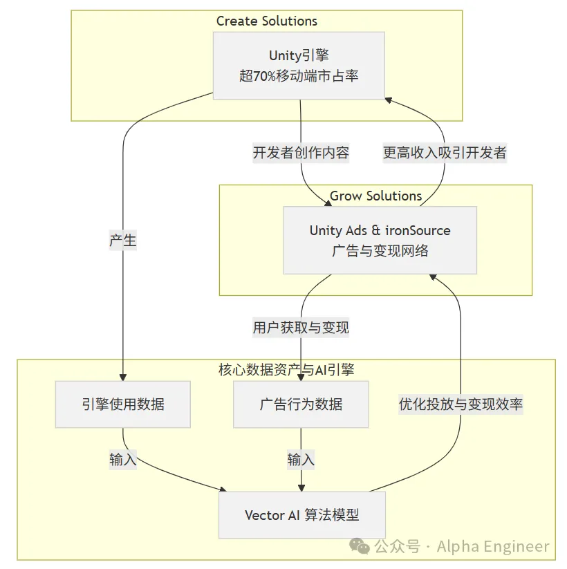 Unity通过Create(创作)和Grow(增长)两大业务构建了独特的“创作-运营”协同飞轮,形成了强大的数据壁垒和网络效应。