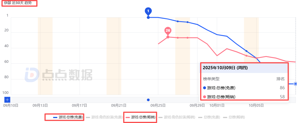 《伊瑟》国服上线至今iOS游戏双榜排名情况