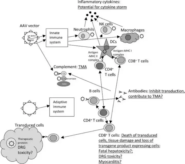 AAV进入人体后,可能激活先天免疫系统,引发由中性粒细胞、自然杀伤细胞和巨噬细胞介导的炎症反应,严重时甚至可能诱发细胞因子风暴;补体系统的参与则可能导致血栓性微血管病变。