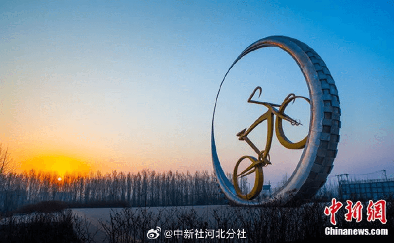 平乡县有一处地标雕塑,由一个巨大的银色车轮和一辆金色自行车组成,名为日升月恒,是中国最大的自行车主题雕塑。