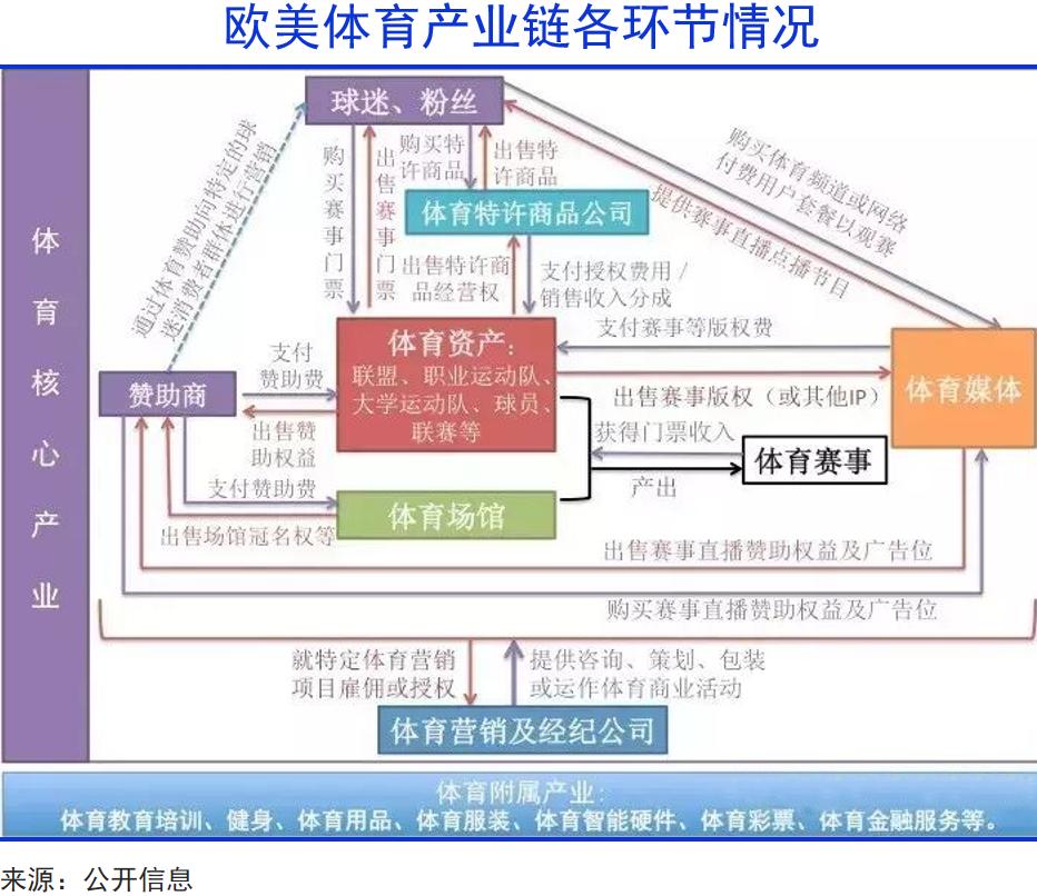 欧美体育早已构建起完整链条,覆盖体育资产、营销经纪、票务、赞助、媒体、周边及博彩等领域。这条产业链以赛事为核心,依托专业营销公司策划推广,借由媒体辐射全球,最终在全球市场形成庞大收入池,商业想象力极大。